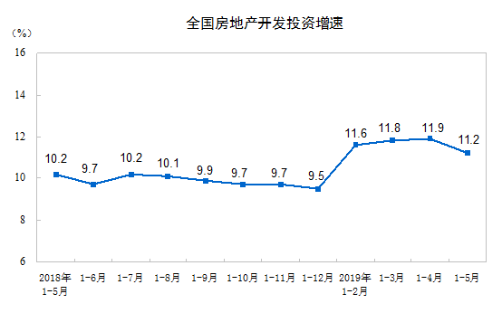 2019年1—5月份,全国房地产开发投资46075亿元,同比增长11.2%,增速比1—4月份回落0.7个百分点。其中,住宅投资33780亿元,增长16.3%,增速回落0.5个百分点。住宅投资占房地产开发投资的比重为73.3%。