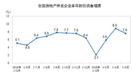 1—5月份,房地产开发企业到位资金66689亿元,同比增长7.6%,增速比1—4月份回落1.3个百分点。其中,国内贷款10762亿元,增长5.5%;利用外资30亿元,增长38.8%;自筹资金20276亿元,增长4.1%;定金及预收款22395亿元,增长11.3%;个人按揭贷款10251亿元,增长10.8%。