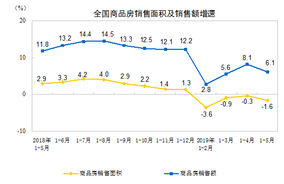 1—5月份,商品房销售面积55518万平方米,同比下降1.6%,降幅比1—4月份扩大1.3个百分点。其中,住宅销售面积下降0.7%,办公楼销售面积下降12.2%,商业营业用房销售面积下降12.9%。商品房销售额51773亿元,增长6.1%,增速回落2个百分点。其中,住宅销售额增长8.9%,办公楼销售额下降12.3%,商业营业用房销售额下降9.7%。