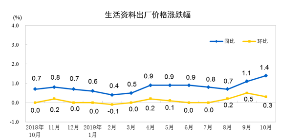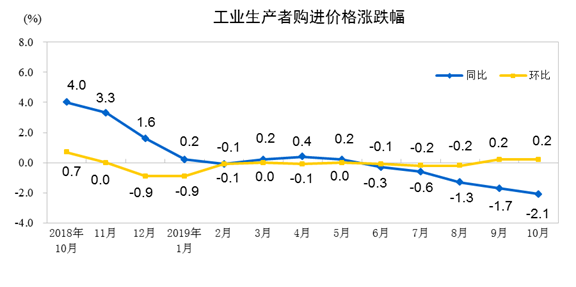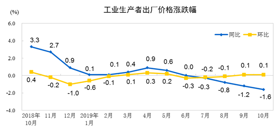 2019年10月份,全国工业生产者出厂价格同比下降1.6%,环比上涨0.1%;工业生产者购进价格同比下降2.1%,环比上涨0.2%。1—10月平均,工业生产者出厂价格比去年同期下降0.2%,工业生产者购进价格下降0.5%。