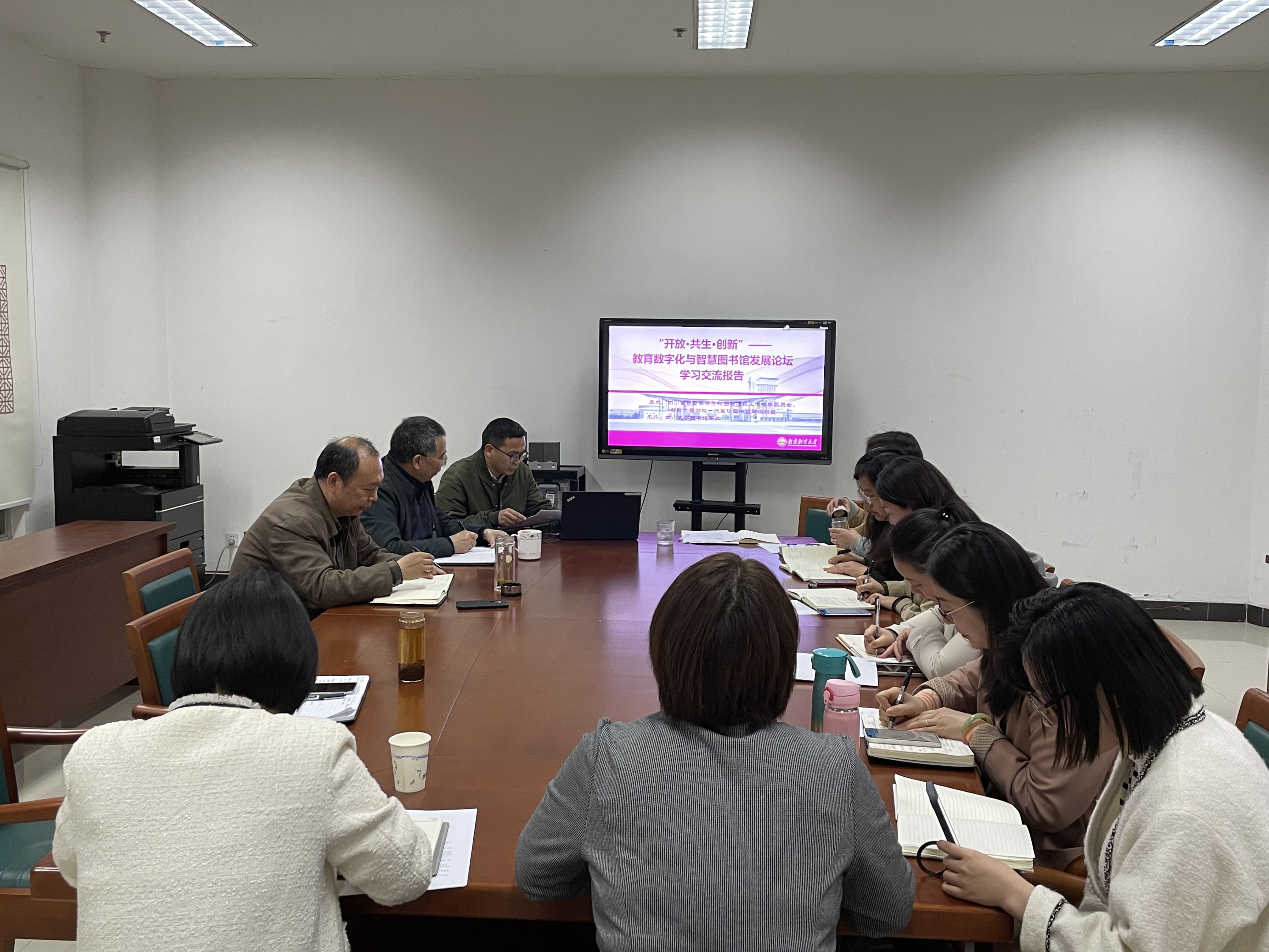 此次会议增加了成果汇报共享环节。为认真贯彻调查研究方面的相关精神和要求,进一步提升图书馆整体学习氛围,加强调研和交流的实际成效,要求今后在外出学习和调研交流后,调研交流的负责同志及时进行调研交流汇报,并依托专题会议、研讨座谈会、“三会一课”以及其他方式开展研讨和学习。此次由陈夏副馆长向与会人员分享“‘开放•共生•创新’——教育数字化与智慧图书馆发展论坛”学习交流心得。