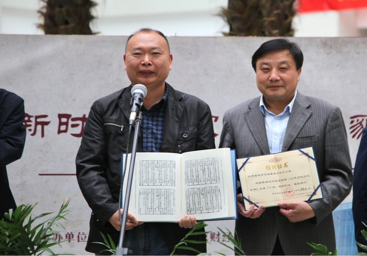 程永上馆长代表图书馆接受《江苏历代方志全书》,并向江龙波副会长颁发捐赠证书。