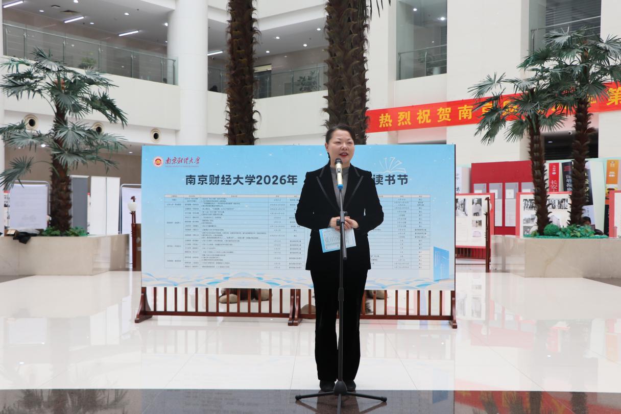 书香润心灵,阅读促成长。近日,南京财经大学2026年“时文书影”读书节暨“全民阅读活动周”开幕式在图书馆二楼大厅举行。党委常委、副校长李煜,南京工业职业技术大学图书馆馆长孟庆杰、南京艺术学院图书馆馆长陈亮,以及校宣传部、团委、外国语学院、图书馆等相关负责人出席仪式,师生齐聚一堂,共同开启这场充满书香与诗意的文化盛宴。开幕式仪式由校图书馆党总支书记高晓东主持。